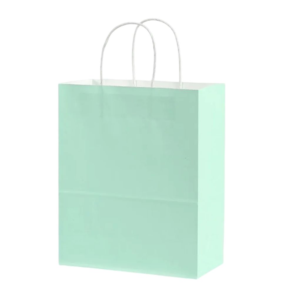 Подарочный пакет из крафтовой бумаги пастельного тона с белыми бумажными ручками, внутренняя сторона белая.