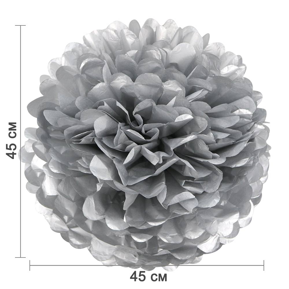 Серебряный бумажный помпон диаметром 45 см — стильное и лёгкое украшение для праздников, фотозон, витрин и интерьера. Отлично подойдёт для дней рождений, свадеб, вечеринок и тематических мероприятий.