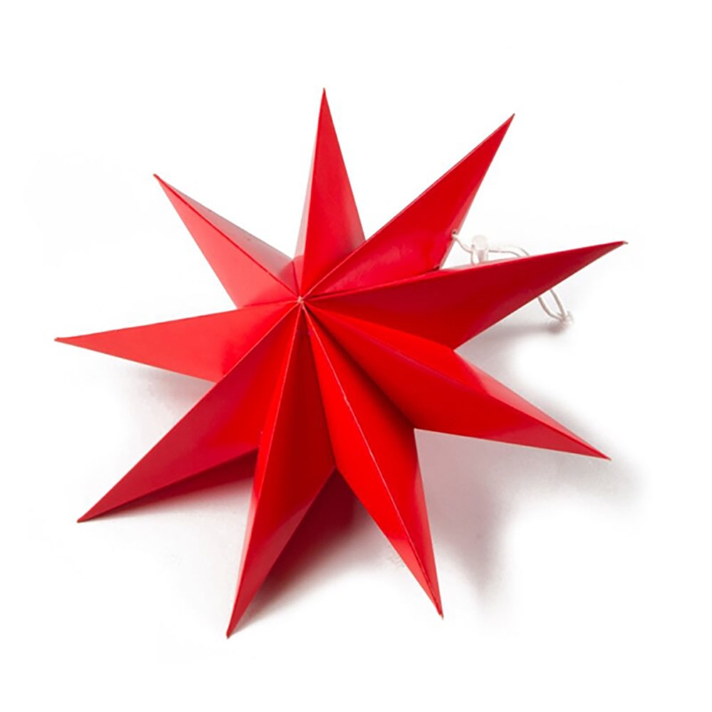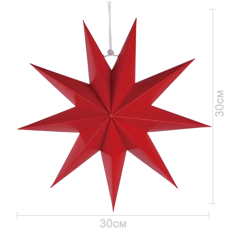 Объёмная декоративная звезда из картона диаметром 30 см с 9 лучами. Оснащена встроенным шнурком для подвешивания. Поставляется в компактном сложенном виде и быстро собирается: специальный шнурок при затягивании придаёт изделию объём и фиксирует форму. После сборки звезда остаётся устойчивой без дополнительных креплений и может использоваться многократно.